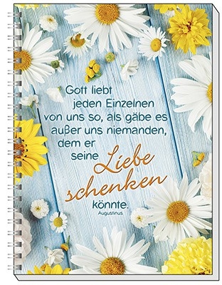 Dieses Notizbuch hat eine praktische Spiralbindung und einen festen Umschlag. Die 80 Innenblätter haben einen zarten, transparenten Druck des Motivs und eine feine Linierung.MEMOS für Notizen, Erinnerungen, Wünsche, für Einkaufszettel, Hinweise, ...Gott liebt jeden Einzelnen von uns so, als gäbe es außer uns niemanden,dem er seine Liebe schenken könnte.Augustinus
