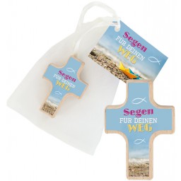 Kreuz aus Buchenholz, natur und farbig bedruckt, 6 x 4 cm; Lieferung in Organzabeutel mit Geschenkanhänger: Segen für deinen Weg. Das Handschmeichlerkreuz ist ein passendes Geschenk für junge Menschen zur Konfirmation oder Kommunion oder zum Geburtstag oder Schulwechsel.
