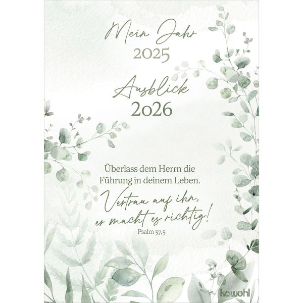 Jahresrückblick-Karten zum JahreswechselDas Ende des Jahres ist eine wunderbare Gelegenheit, innezuhalten und die Ereignisse der letzten 12 Monate zu reflektieren. Unsere stilvoll gestalteten Karten bieten auf der Rückseite Platz, um die Höhepunkte sowie die schwierigen Momente festzuhalten und Gebete für das bevorstehende Jahr zu notieren. Ein ermutigender Bibelvers auf der Vorderseite schenkt Ihnen immer wieder neue Kraft.
