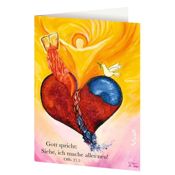 Hochwertige KlappkartenGott spricht: Siehe, ich mache alles neu heißt es am Ende der Bibel in der Offenbarung 21,5. Und so lautet auch das Motto für die Jahreslosung 2026. Die bekannte Autorin und Ordensfrau Schwester Teresa Zukic ist auch als Malerin aktiv. Sie hat die Botschaft in Farben und Symbolen gezeichnet. Das Gemälde zeigt u.a. einen gelben Engel hinter einem rotblauen Herzen und der weißen Taube. Zusammen mit dem Offenbarungs-Vers lädt das Bild ein, inne zu halten, um über das Ende der Welt und gleichzeitig über die Neuschöpfung nachzudenken, die Gott für die Menschen bereithält. Die Jahreslosung wird von der Ökumenischen Arbeitsgemeinschaft für Bibellesen für jedes Jahr als Leitvers ausgewählt. gut beschreibbar mit passendem Umschlag